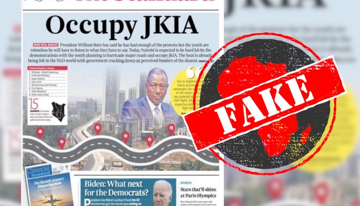 IN SHORT: A front page allegedly from Kenya’s Standard newspaper is circulating on social media with the headline “Occupy JKIA”. But it has been manipulated.