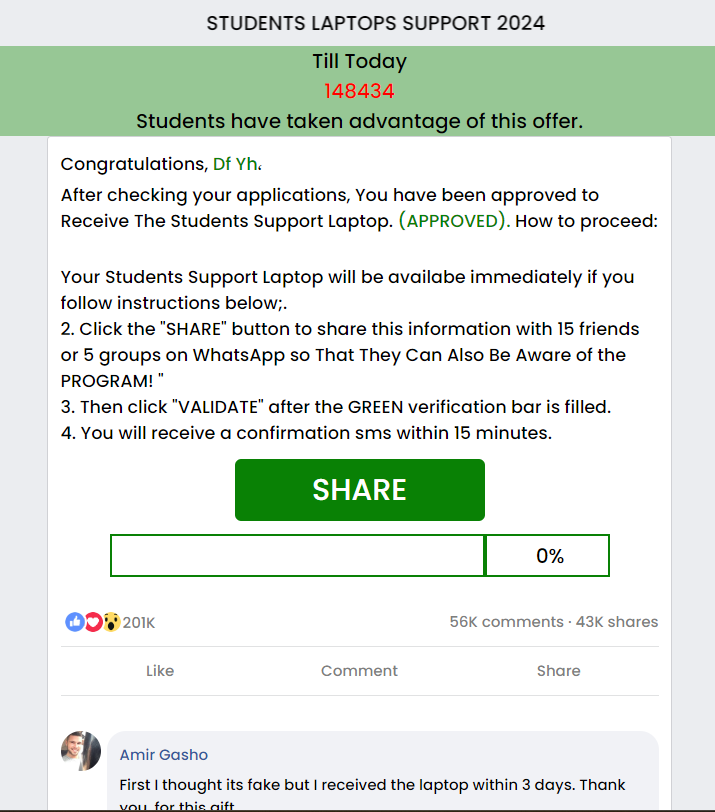 IN SHORT: These posts and a website promise laptops to thousands of students who cannot afford them. But this is a classic example of engagement bait, and those behind it may be trying to steal your valuable personal information.