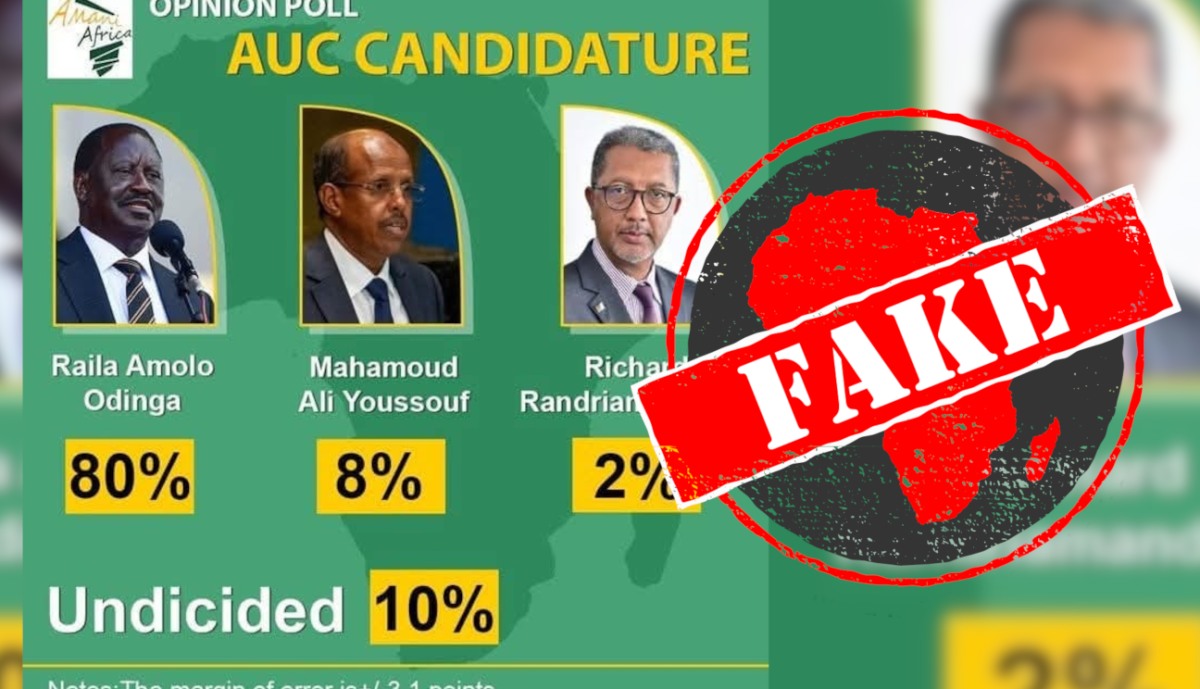 IN SHORT: Kenyan opposition leader Raila Odinga is vying for the position of chairperson of the African Union Commission. On the eve of a live debate among candidates, a digital card with an opinion poll declaring Odinga was in the lead began circulating on social media. However, the poll is fake.