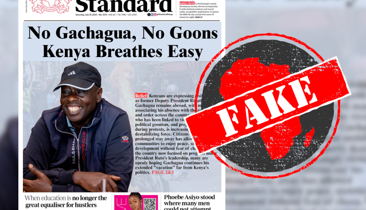 IN SHORT: An image of a front page supposedly from Kenya’s Standard newspaper claims there has been peace in the country since former deputy president Rigathi Gachagua left for the US. However, the front page is digitally altered.