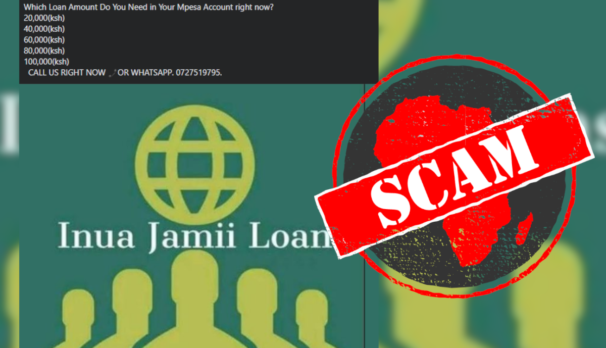 The account claims that the loans are from Inua Jamii, the Kenyan government programme that gives cash grants to poor and vulnerable people. “Inua Jamii” is Kiswahili for “uplift the community”.