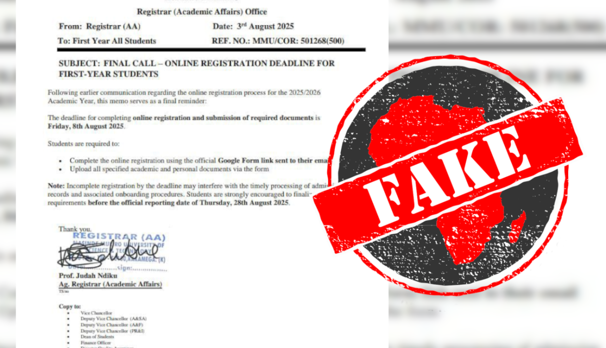 IN SHORT: A memo supposedly from Masinde Muliro University in Kenya claims the deadline for online registration for first-year students is fast approaching. But the university says the document is fake.