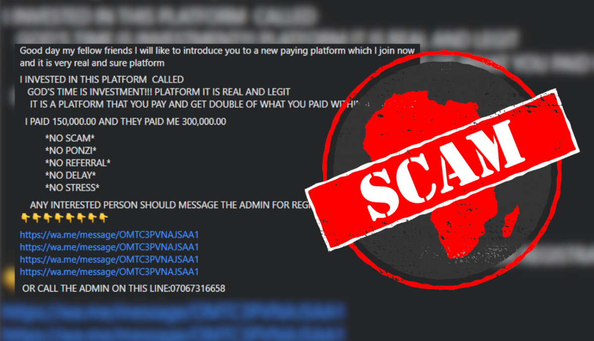IN SHORT: Some Facebook posts claim that users who join the “God’s Time Is Investment” investment platform can double their money in less than an hour. Africa Check found that the platform is not legitimate and users should steer clear of it.