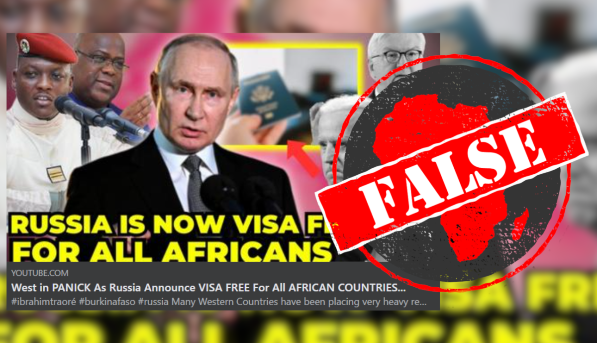 Russia is now visa-free for all African countries. That’s the claim in two YouTube videos that have been going viral on Facebook since April 2024.
