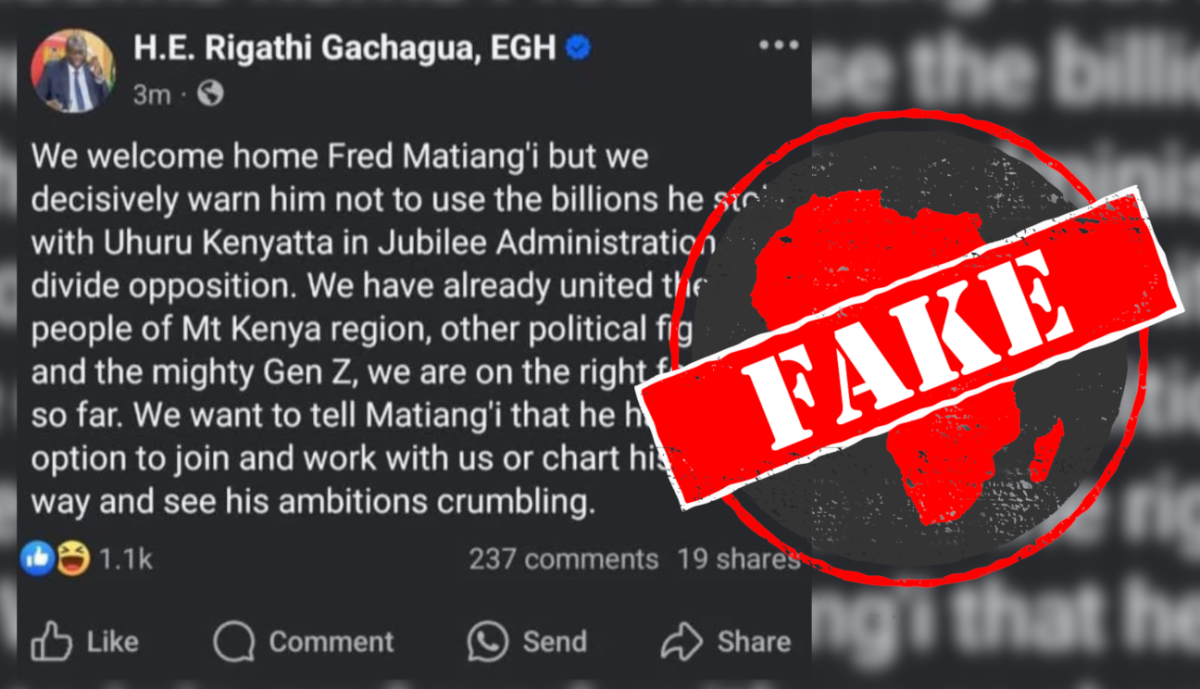 We looked for the post on Gachagua’s verified Facebook page but came up empty.