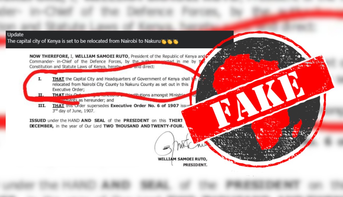 IN SHORT: A fake “executive order” claimed Kenyan president William Ruto had relocated the country’s capital city from Nairobi to Nakuru. Such a move would be unmissable – it requires a change of law and rigorous public debate. Ignore phony paperwork.