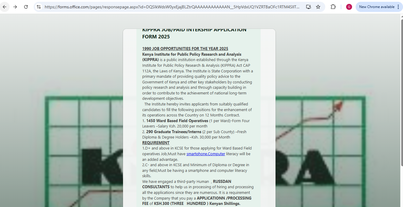 Furthermore, the involvement of a third-party recruitment firm that demands an application fee raises serious concerns. Kenyan public institutions, including Kippra, do not require payments for job applications or internships.