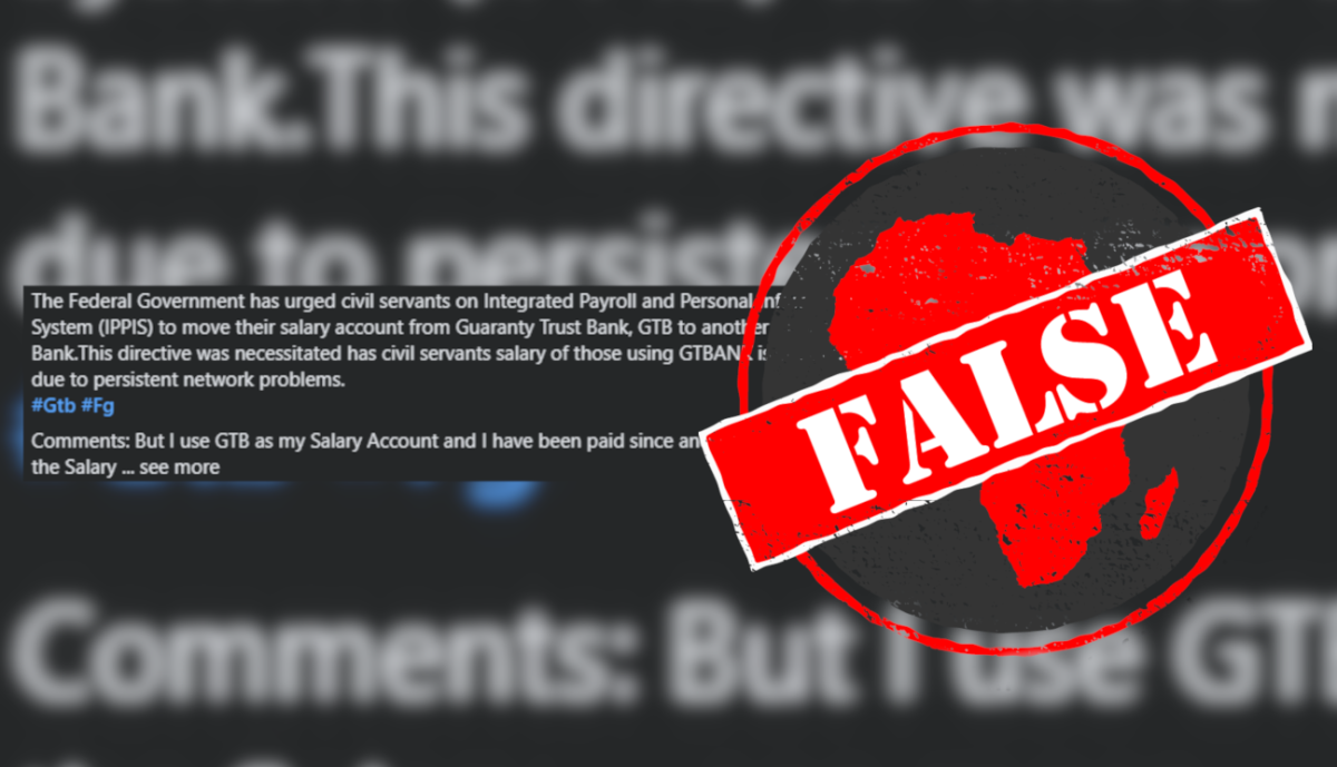 One of the Facebook posts begins: “The Federal Government has urged civil servants on Integrated Payroll and Personal Information System (IPPIS) to move their salary account from Guaranty Trust Bank, GTB to another Commercial Bank.”