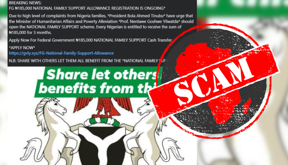 IN SHORT: Nigerian families struggling to make ends meet should ignore posts encouraging them to apply for the N185,000 “family support scheme”. There is no such programme from the government and these posts are out to scam the public.