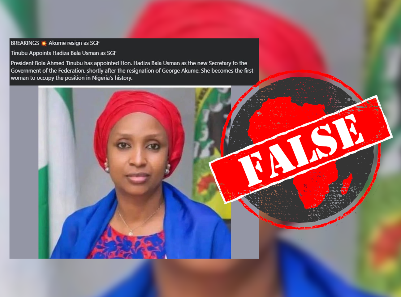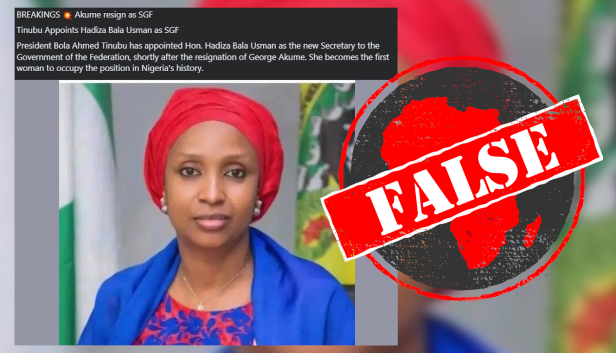 IN SHORT: Multiple Facebook posts claim that the secretary to the Nigerian government of the federation, George Akume, has resigned, and president Bola Tinubu has appointed one of his advisers, Hadiza Usman, as a replacement. This would make Usman the first woman to hold the position, but the presidency has debunked the claim.