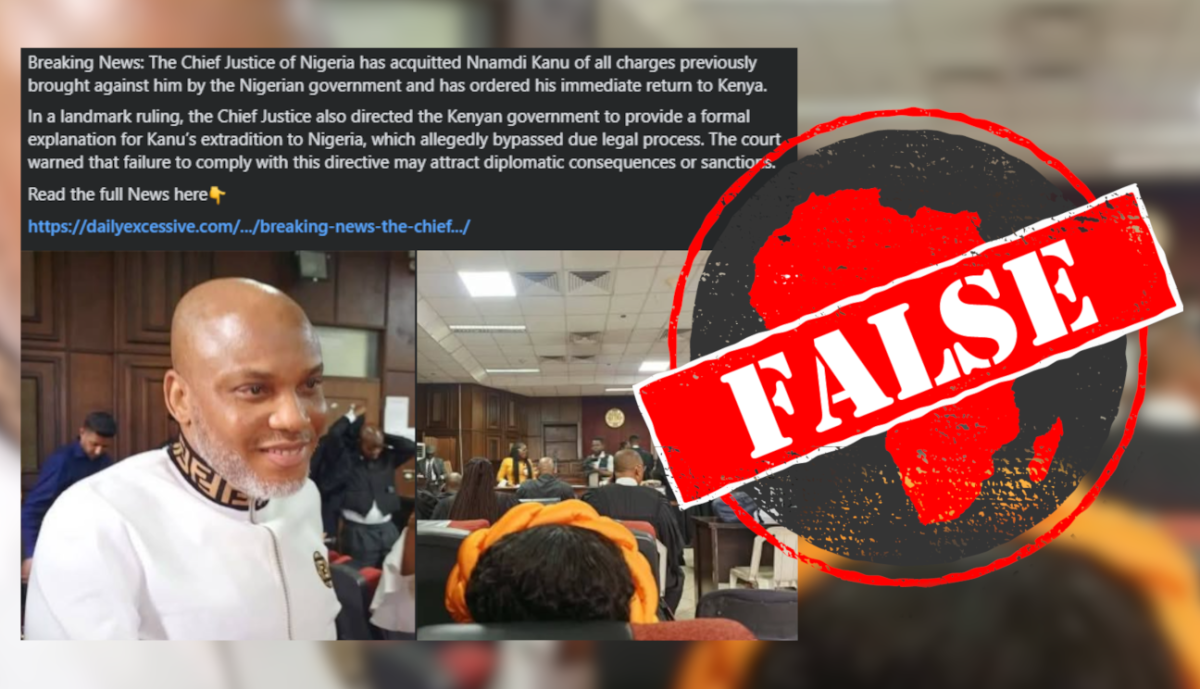 We found no evidence to support the claim that Nigeria’s chief justice has acquitted Kanu of all charges and ordered he be returned to Kenya.