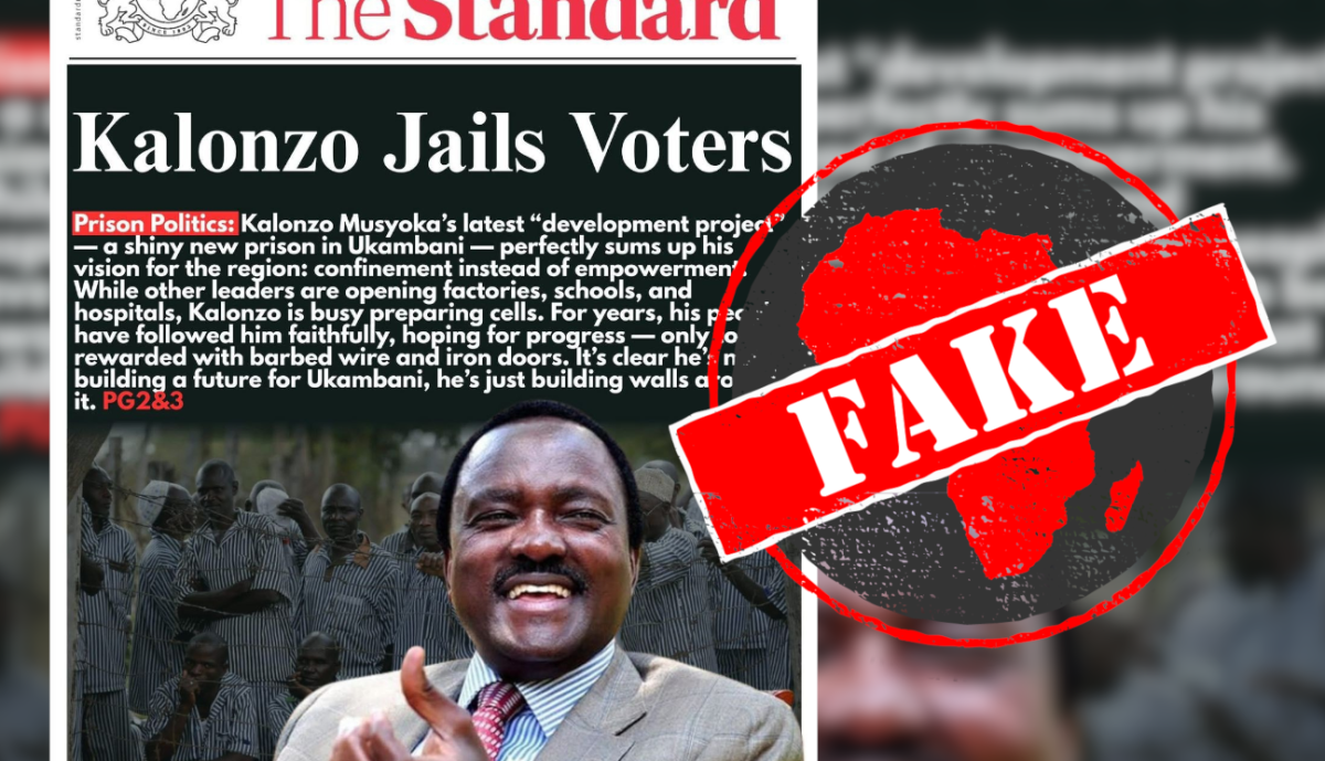 IN SHORT: A newspaper front page mimicking the design of Kenya’s Standard newspaper ridicules opposition politician Kalonzo Musyoka by claiming he built a prison to jail his people. However, it is one of many fabricated front pages targeting Kenyan politicians with false allegations.
