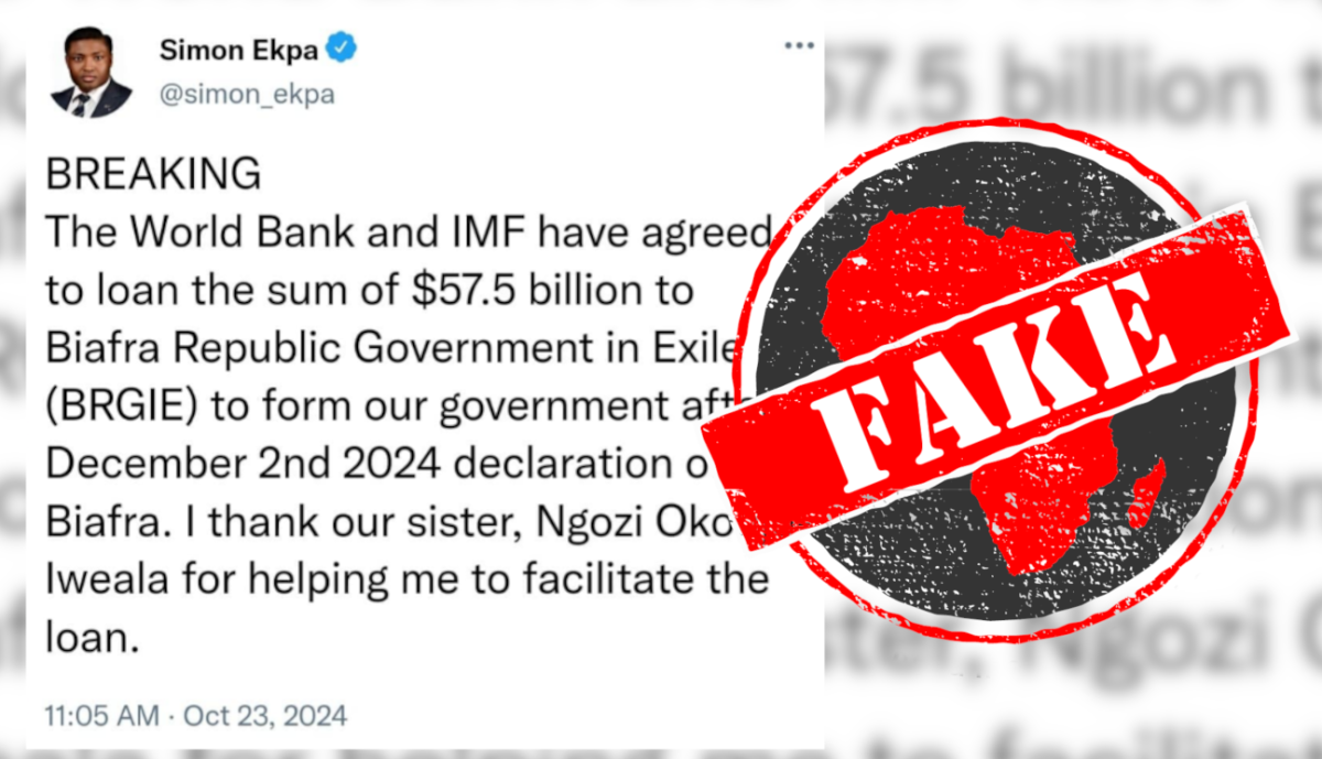 There is no evidence linking Simon Ekpa to the tweet in the viral screenshot – it appears to have been fabricated. And there is no evidence that Okonjo-Iweala helped pro-Biafran separatists secure a loan from the World Bank or IMF.