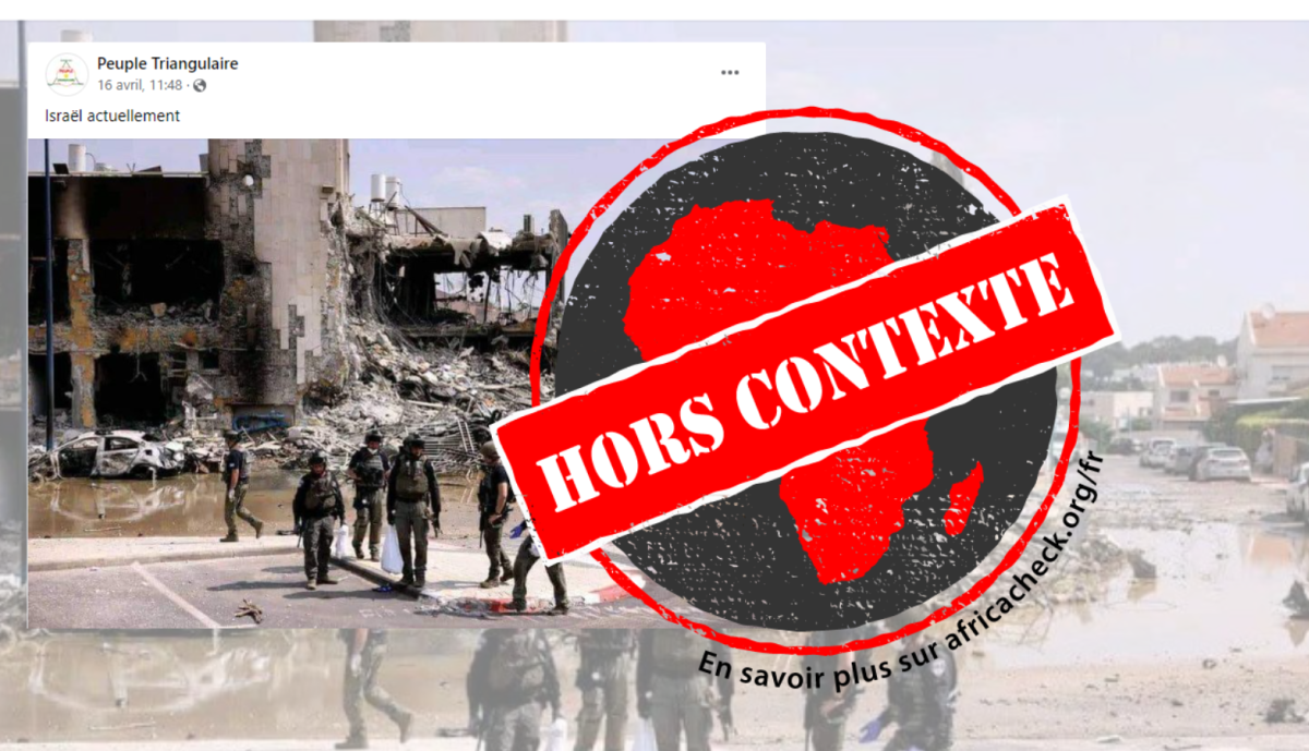 Le 16 avril 2024, la page Facebook Peuple Triangulaire a publié une photo montrant un immeuble complètement détruit. « Israël actuellement », indique la légende accompagnant la photo. Des internautes ont relayé cette publication sur le réseau social (1, 2).