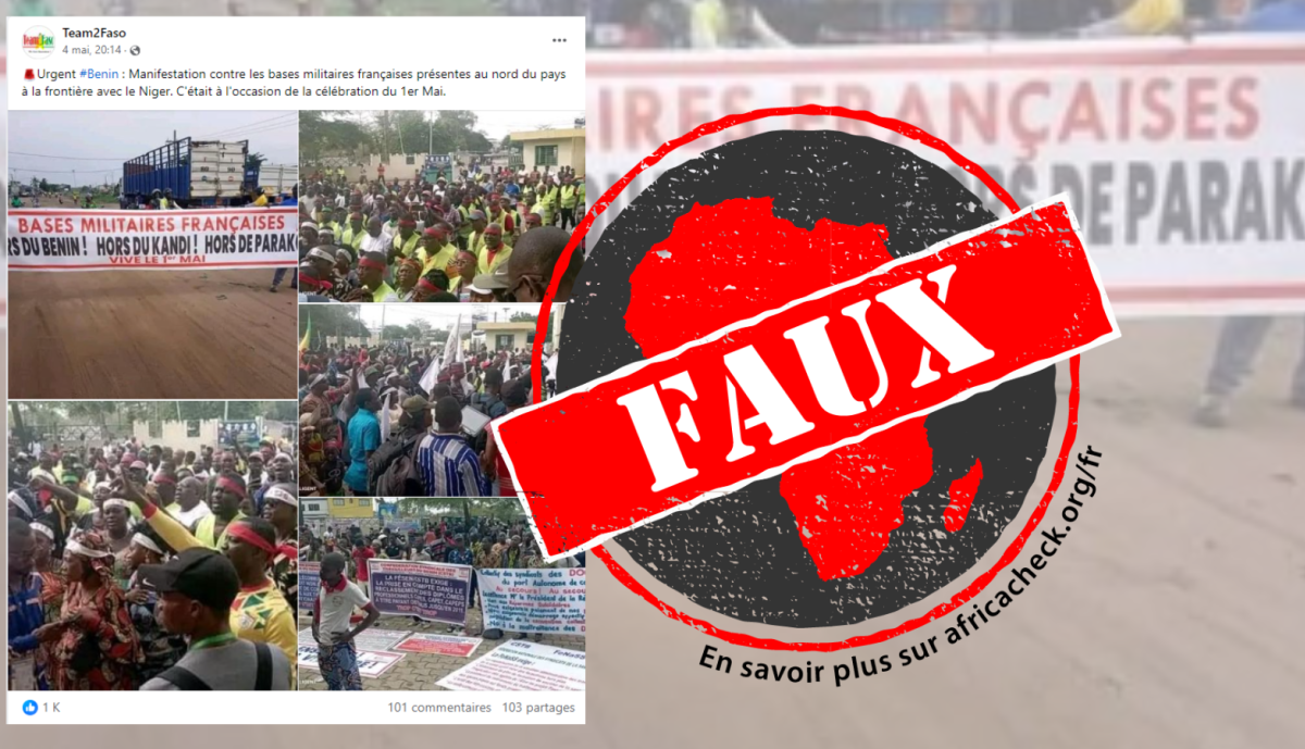 C’est dans ce contexte que la page Facebook Team2Faso a publié, le 4 mai 2024, une série de cinq images prétendant montrer une manifestation au Bénin contre la présence de bases militaires françaises dans le pays.