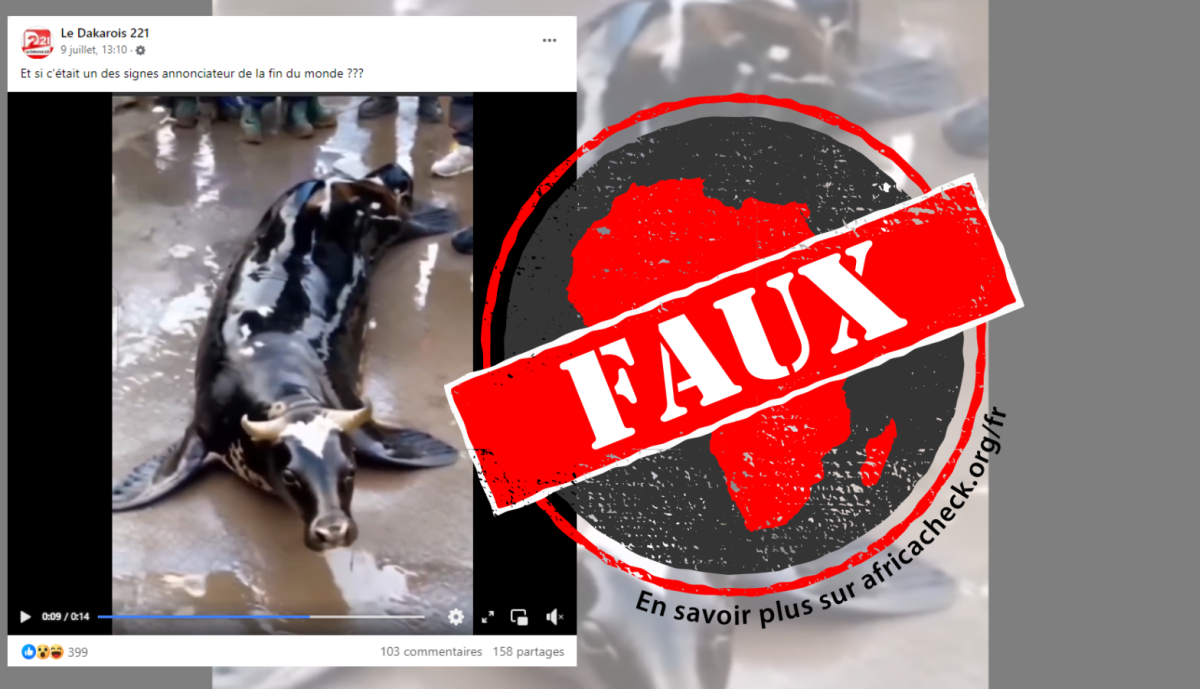 La vidéo donne à voir un étrange animal ressemblant à une vache ayant des nageoires. Plusieurs personnes entourent ledit animal qui semble avoir échoué sur une plage. « Et si c'était un des signes annonciateur de la fin du monde ??? », peut-on lire à travers le texte qui accompagne la vidéo. Des publications similaires ont été faites par d’autres internautes sur Facebook (1,2).
