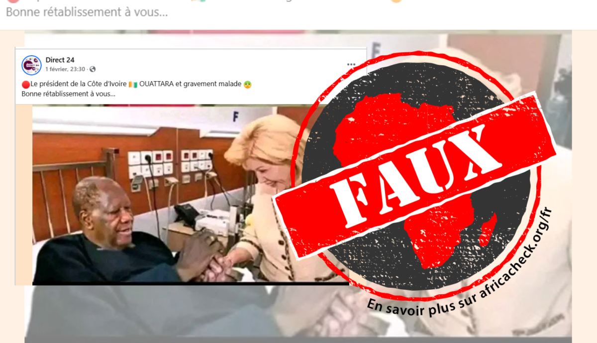 Sur Facebook, la page Direct 24 basée en Guinée a publié, le 1ᵉʳ février 2025, une photo montrant le président ivoirien Alassane Dramane Ouattara couché sur un lit d’hôpital, tenant les mains son épouse Dominique Ouattara. « Le président de la Côte d’Ivoire 🇨🇮 OUATTARA et gravement malade (Sic) », est-il indiqué dans la légende de la publication.
