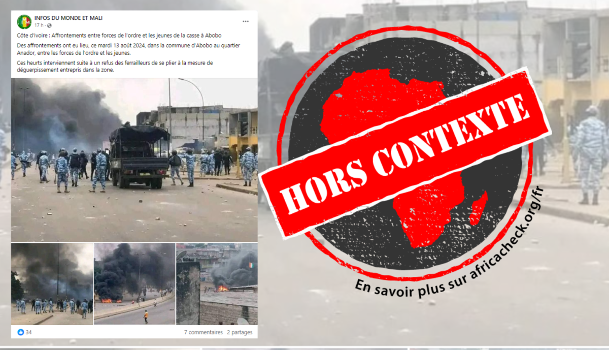C’est dans ce contexte que le 13 août 2024, la page Facebook INFOS DU MONDE ET DU MALI a fait une publication illustrée de quatre images censées avoir été prises lors des affrontements entre la police ivoirienne et des riverains d’Abobo.