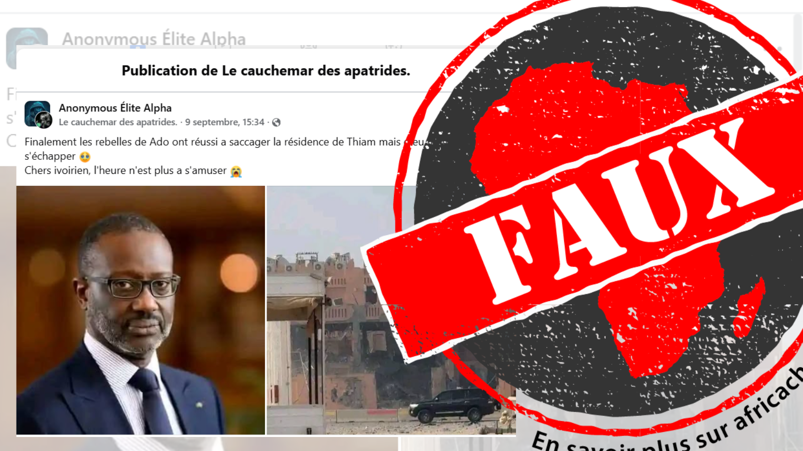 Ainsi, le 9 septembre 2025 une publication sur Facebook affirme : « Finalement, les rebelles d’Ado (surnom populaire désignant Alassane Ouattara, NDLR) ont réussi à saccager la résidence de Thiam, mais Dieu merci, il a pu s’échapper. Chers Ivoiriens, l’heure n’est plus à s’amuser. » Cette publication est illustrée par un photomontage sur lequel on peut distinguer une photo de Tidjane Thiam et l’image d’une maison en ruine avec une voiture garée devant. Cette publication a été reprise par d'autres sur le réseau social (1, 2, 3).
