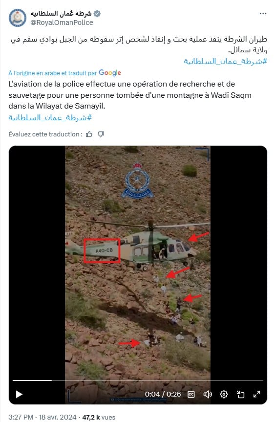 Par ailleurs, des recherches sur l’aéronef A40-CB, nous ont permis de retrouver ici, une vidéo partagée le 3 novembre 2015, par le média Times of Oman. Elle montre l’utilisation du modèle d’hélicoptère A40-CB par la police d’Oman dans un sauvetage.