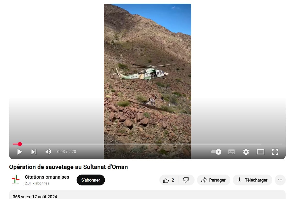 D’autres recherches nous permettent de retrouver la totalité de la vidéo que nous vérifions dans une publication YouTube datant du 17 août 2024. D’après l’intitulé, elle montre une opération de sauvetage au Sultanat d’Oman.