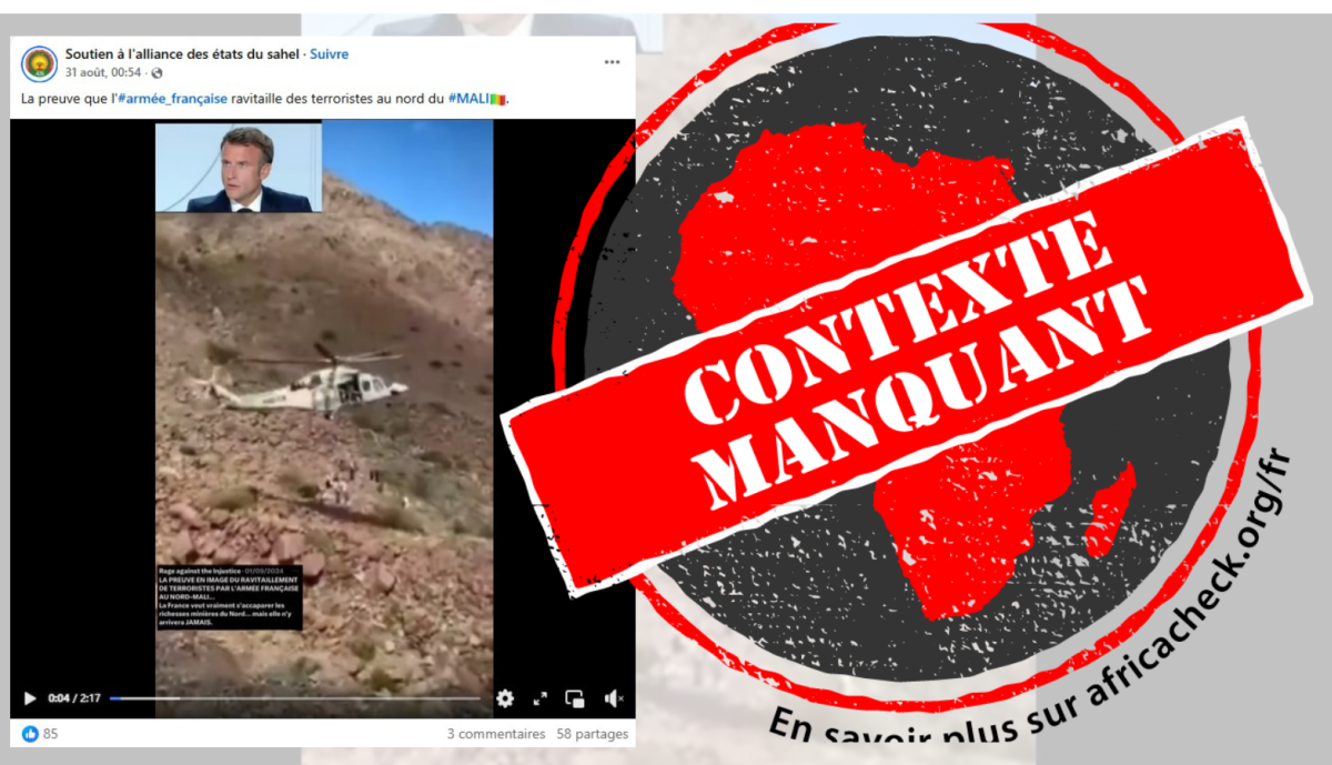 C’est suivant ce contexte qu’une publication vidéo faite le 31 août 2025 sur Facebook par la page Soutien à l’alliance des états du sahel prétend montrer, « la preuve en images du ravitaillement de terroristes par l’armée française au Nord-Mali ».