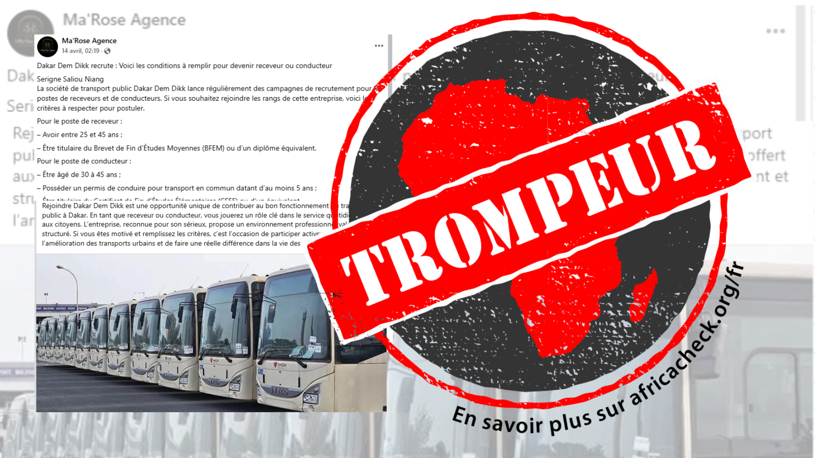 Le 13 avril 2025, une page Facebook appelée « Ma'Rose Agence », a partagé une annonce censée émaner de la société sénégalaise de transport public Dakar Dem Dikk.