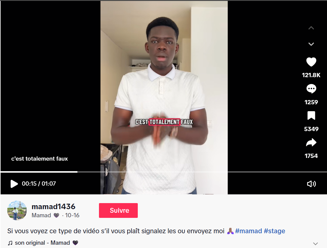 « Ils me disent qu’ils ne vont pas le faire parce que apparemment, ça a percé. … Donc, je vous demande, s’il vous plaît, si vous voyez ce type de vidéo, signalez-la, puisqu'à chaque fois, c'est à moi de rétablir la vérité », déclare le jeune homme.