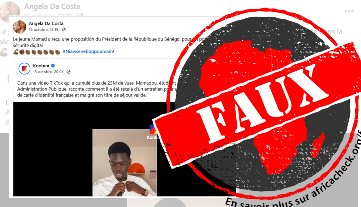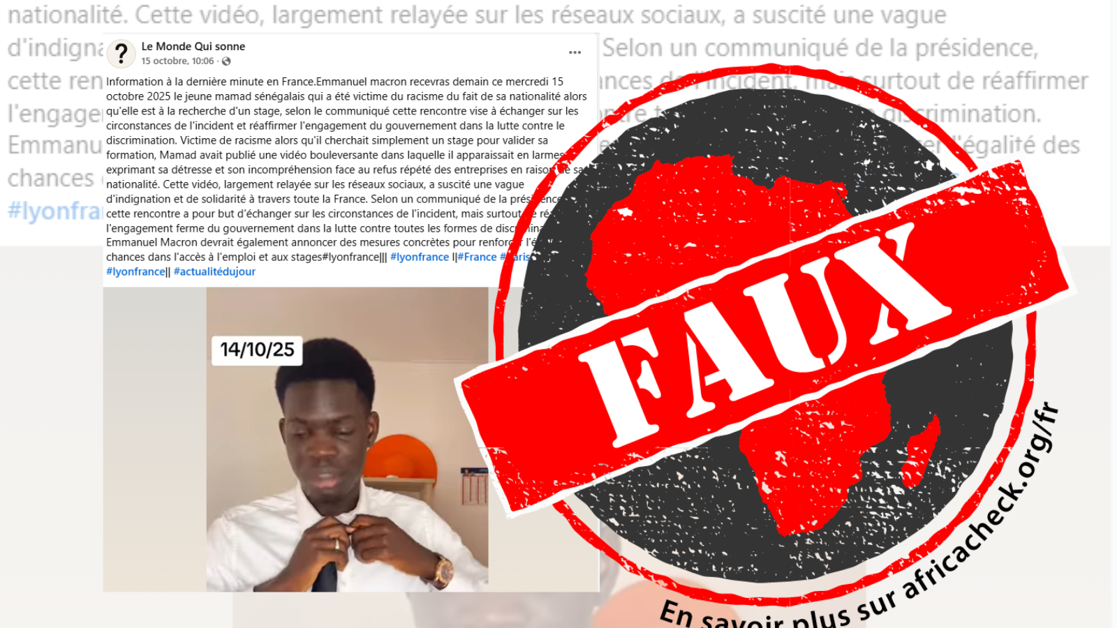 Dans une autre publication faite le 15 octobre 2025, la page Facebook Le Monde Qui sonne affirme que, selon un communiqué, le président français Emmanuel Macron recevra « le jeune mamad sénégalais qui a été victime du racisme du fait de sa nationalité alors qu'elle est à la recherche d'un stage ». D’après la publication qui comporte plusieurs fautes d’écriture, « cette rencontre vise à échanger sur les circonstances de l'incident et réaffirmer l'engagement du gouvernement dans la lutte contre le discrimination (sic) ».
