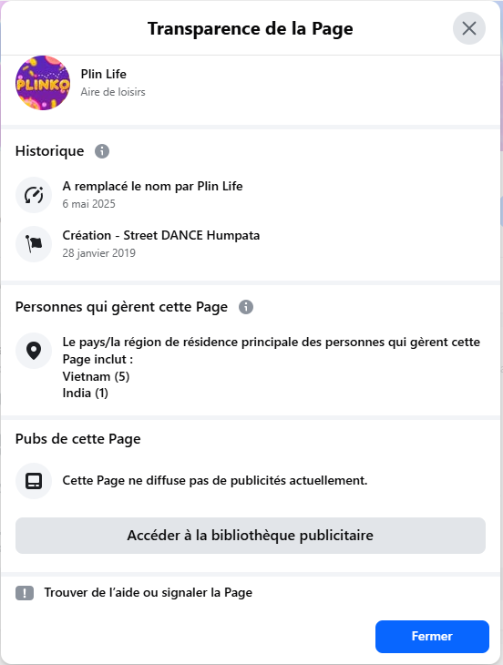 La page a été créée le 28 janvier 2019 sous le nom Street DANCE Humpata avant d’être renommée Plin Life le 6 mai 2025. Elle est administrée depuis le Vietnam et l'Inde selon les données fournies sur sa transparence.