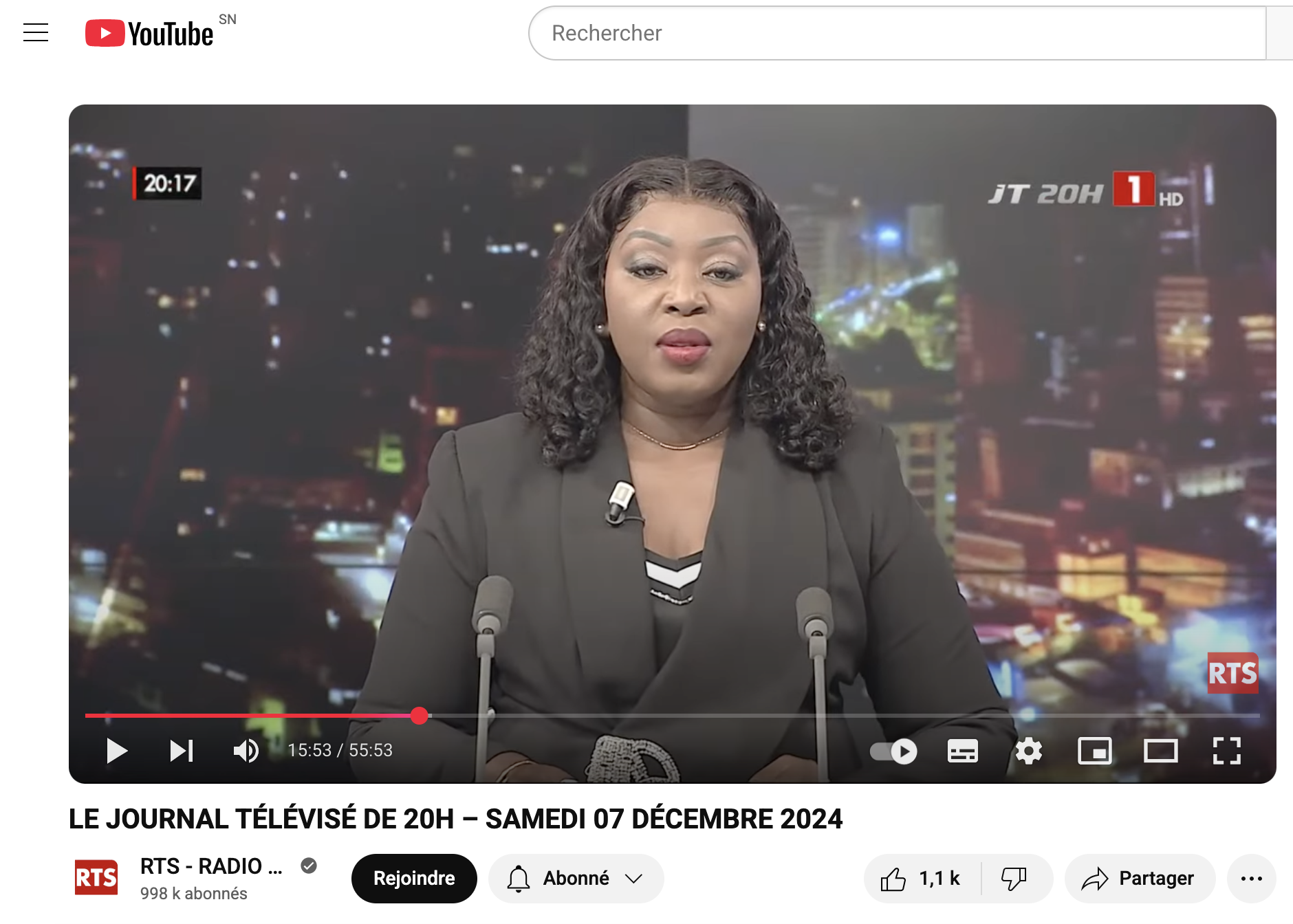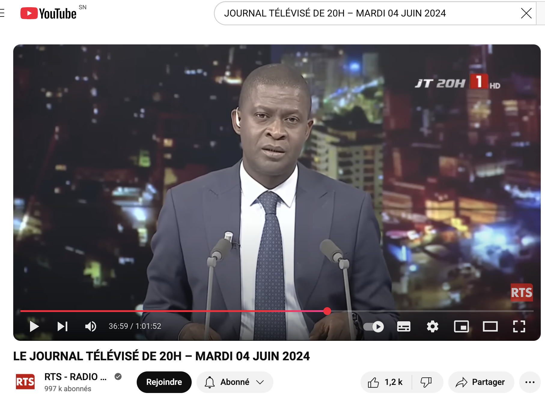 La deuxième séquence mettant en scène Ibrahima Diédhiou, également journaliste à la RTS, provient du journal télévisé de la RTS diffusé le 4 juin 2024 sur leur chaîne YouTube.