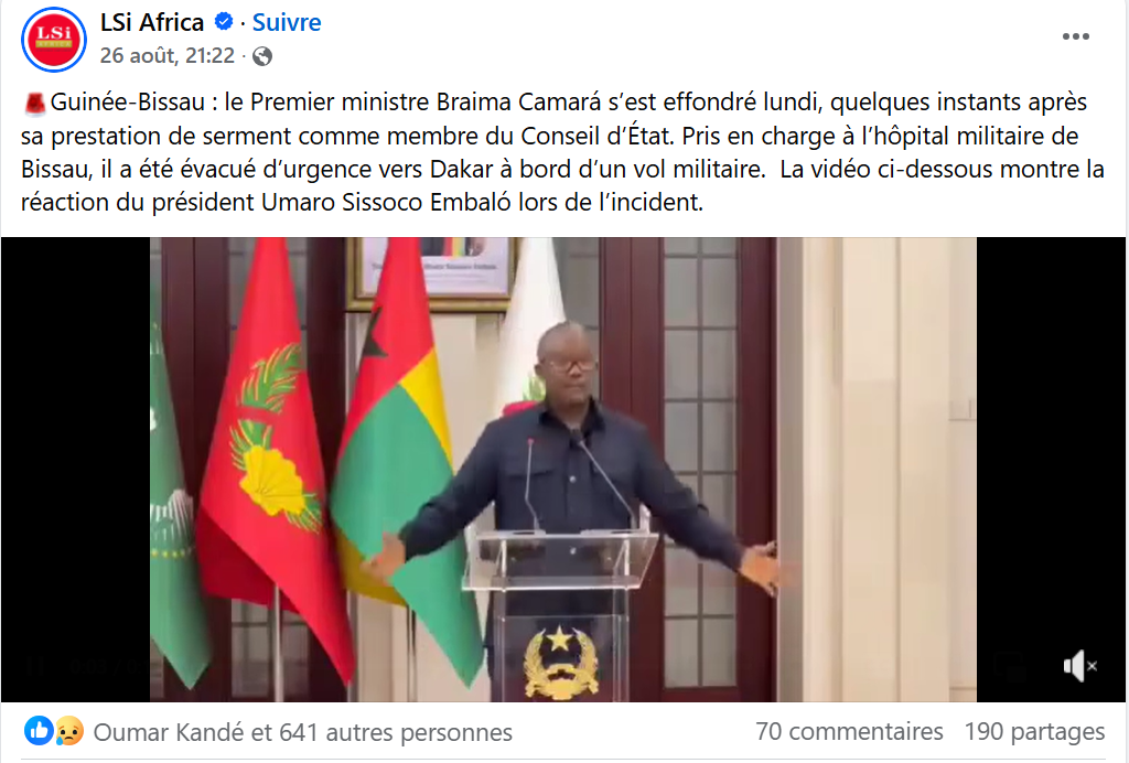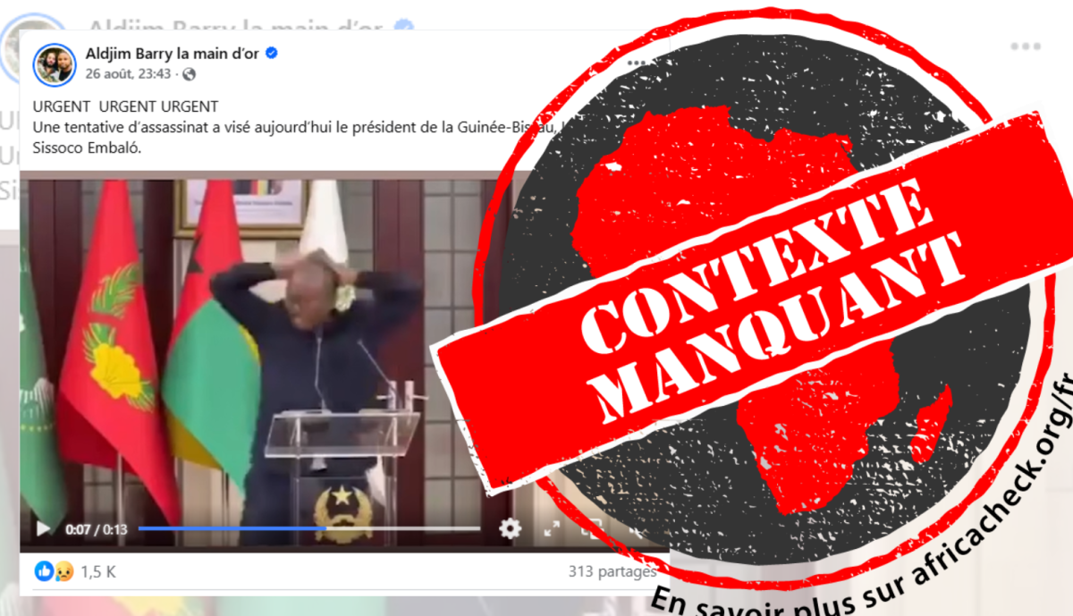 Sur Facebook, un utilisateur a publié le 26 août 2025 une vidéo de 13 secondes sur laquelle on peut reconnaître le président de la Guinée-Bissau Umaro Sissoco Embaló debout devant un pupitre. Le dirigeant réagit tout à coup de façon soudaine, en levant les mains dans un mouvement de panique, sortant de la scène. On voit également d’autres personnes présentes sur les lieux s’agiter dans l’affolement.