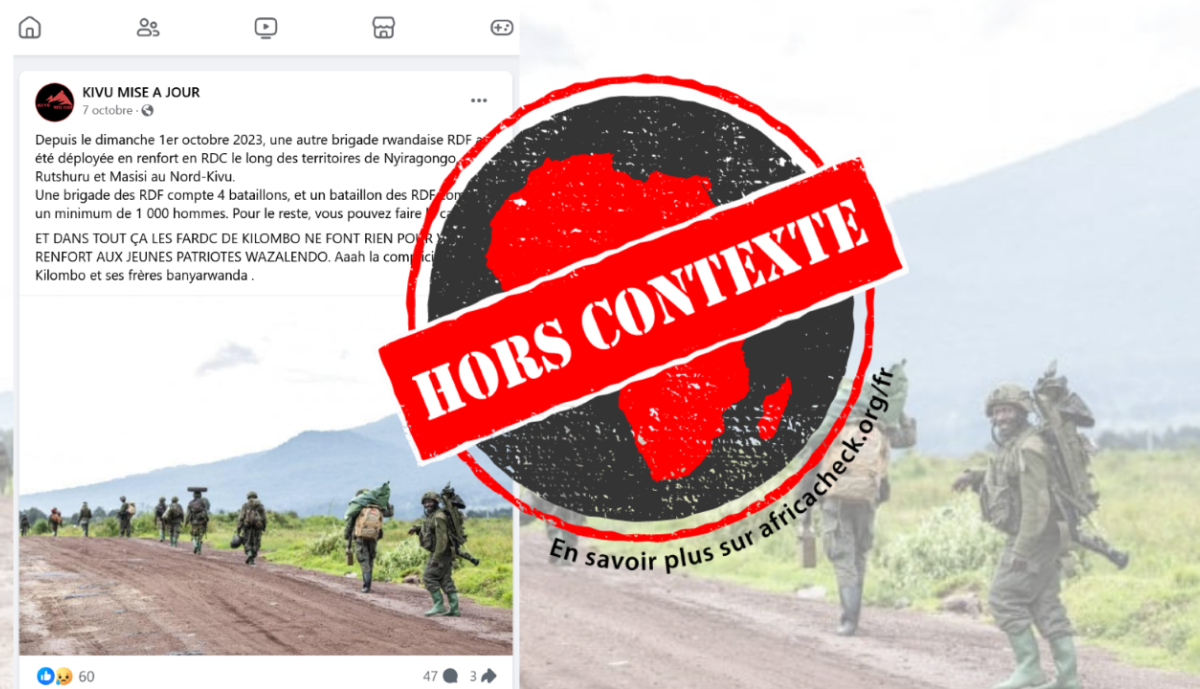 C’est dans ce contexte qu’une page Facebook appelée KIVU MISE A JOUR (KivuInfoUpdates dans l’adresse de la page) a publié le 7 octobre 2023 un texte accompagné d’une photo évoquant le déploiement de soldats rwandais dans l’est de la RDC, en « renfort ».